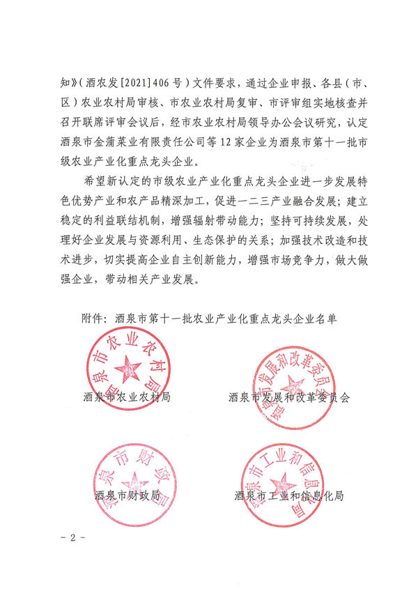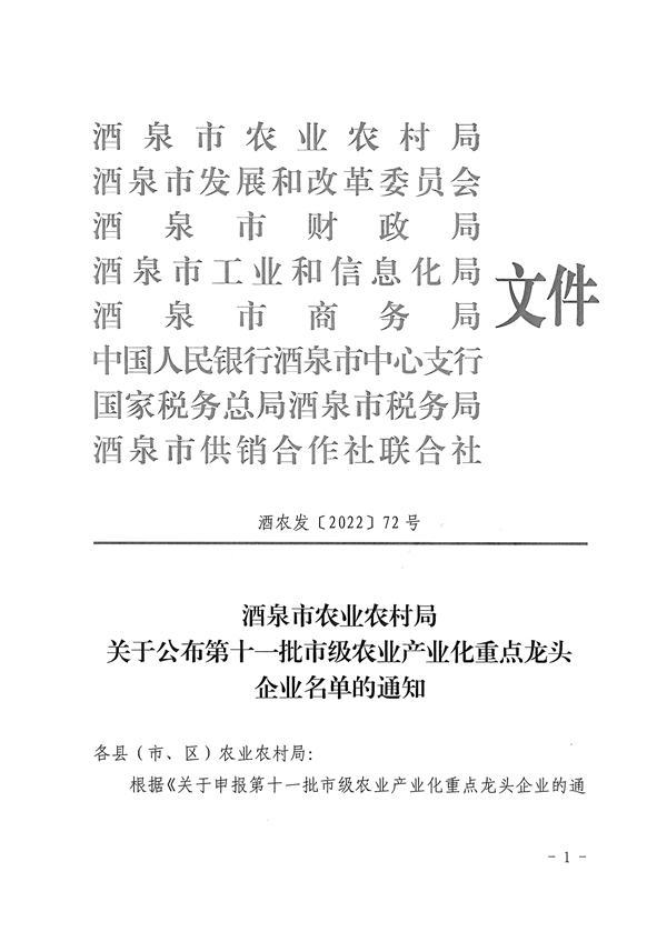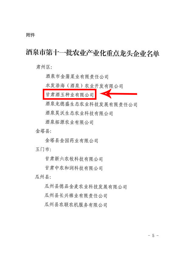 祝賀甘肅酒玉種業(yè)有限公司被認定為酒泉市農(nóng)業(yè)產(chǎn)業(yè)化市級龍頭企業(yè)