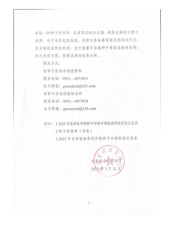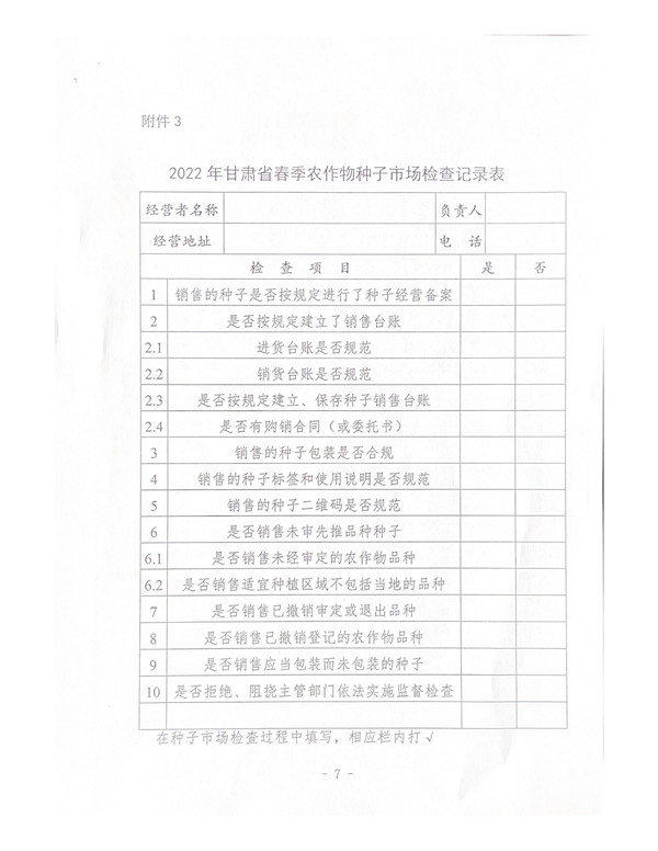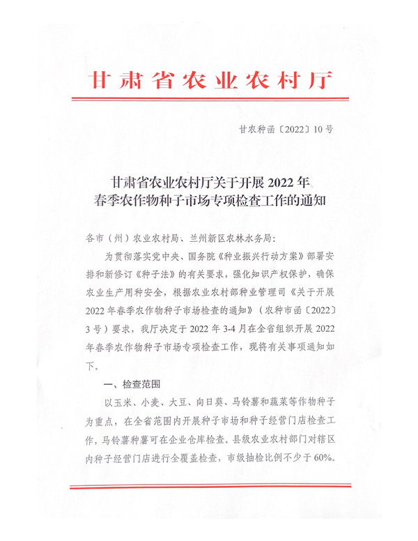 甘農(nóng)種函〔2022〕10號 甘肅省農(nóng)業(yè)農(nóng)村廳關于開展2022年春季農(nóng)作物種子市場專項檢查工..
